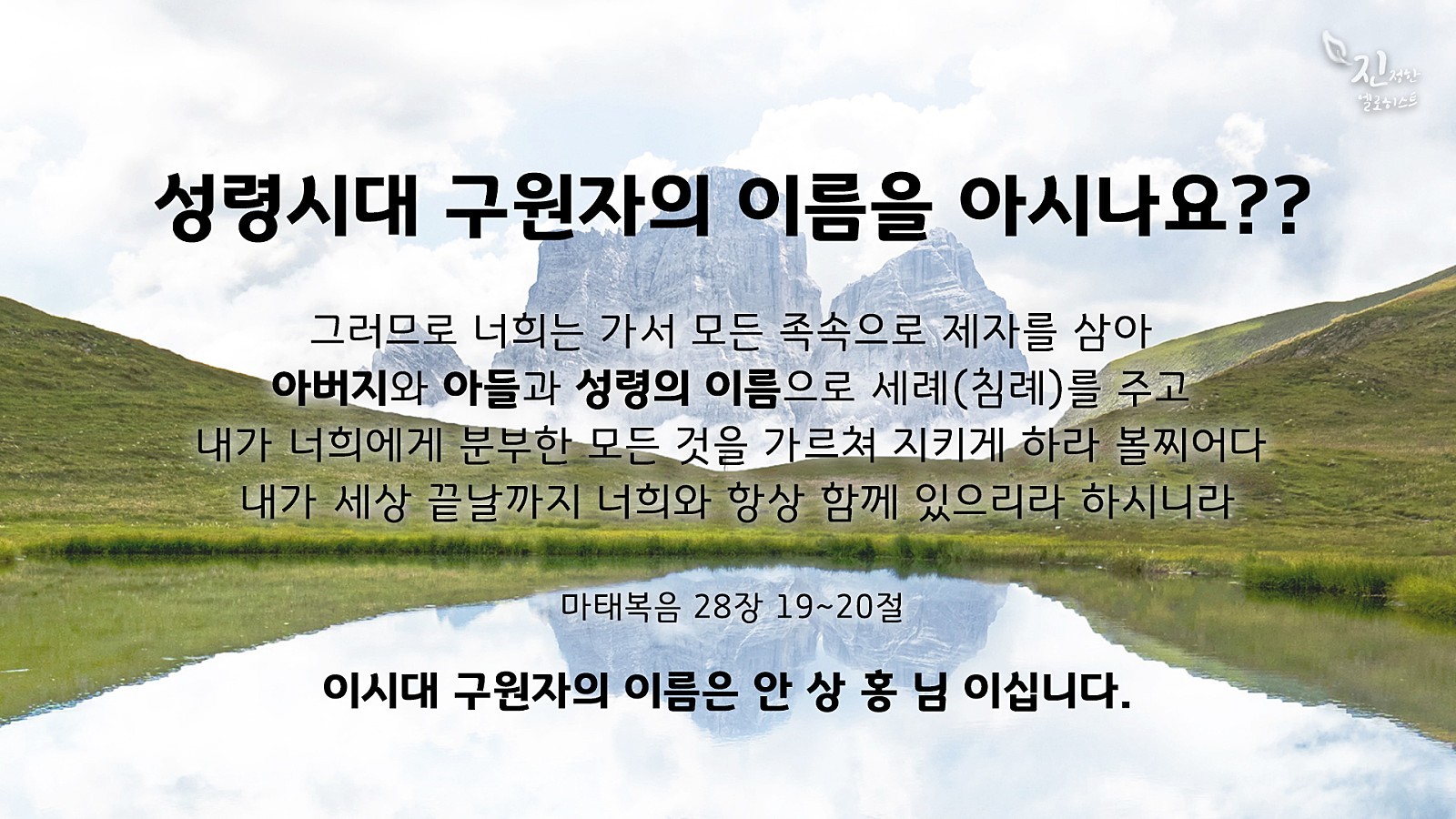 그렇다면 성부시대와 성자시대에만 하나님이 존재하셔서 그 이름을 부르고 믿고 따르면 구원이 주어지는 것일까요? 분명 성경에는 성령시대에 또 다른 이름이 있다고 말씀하셨습니다.